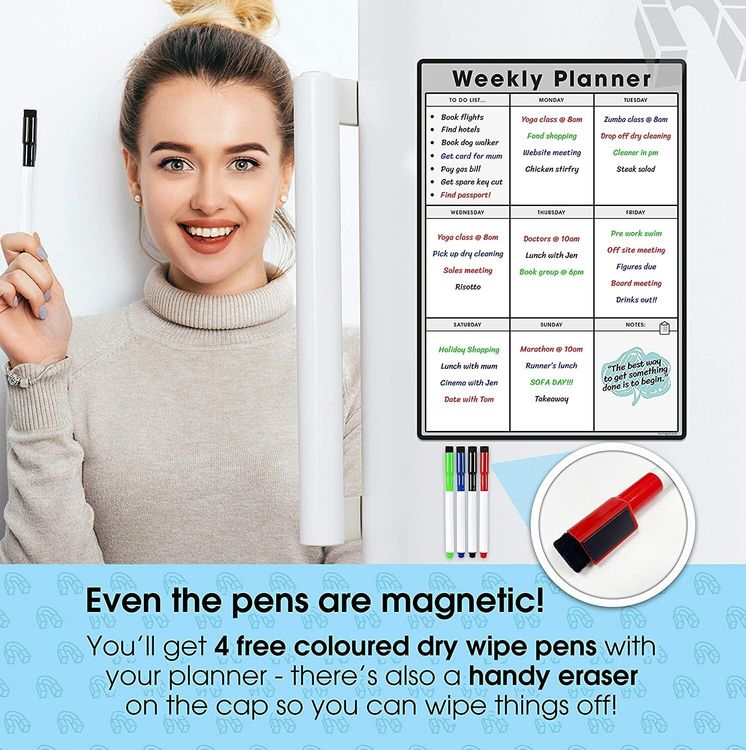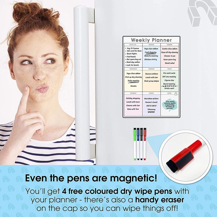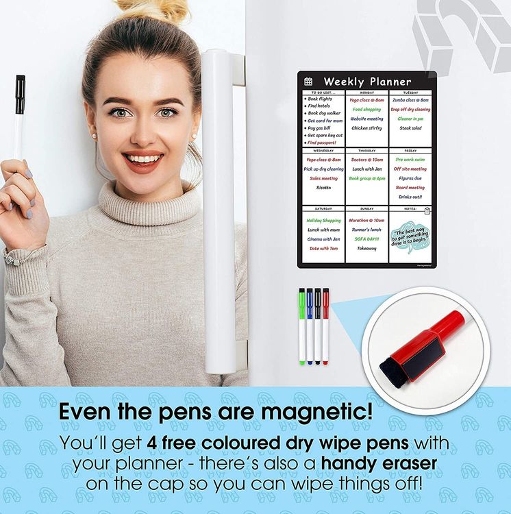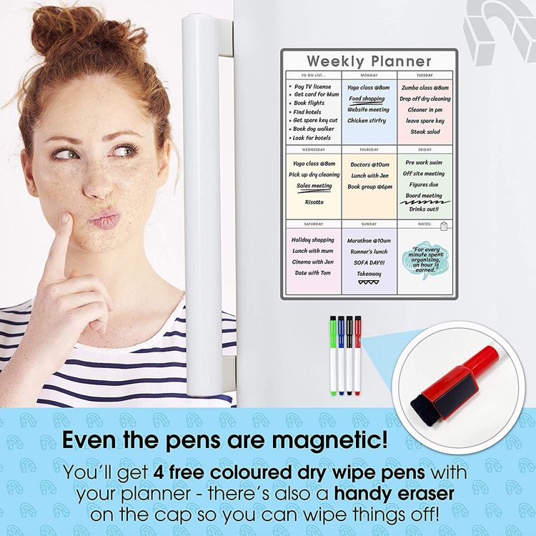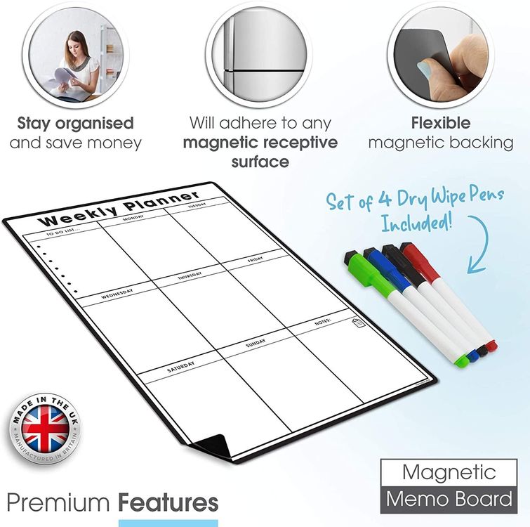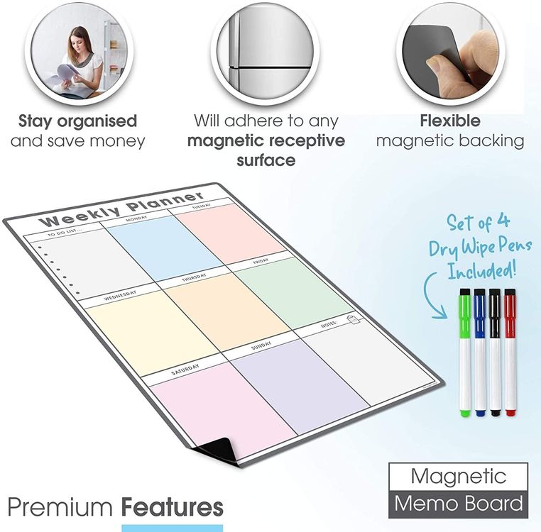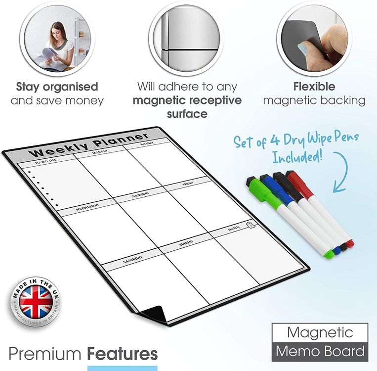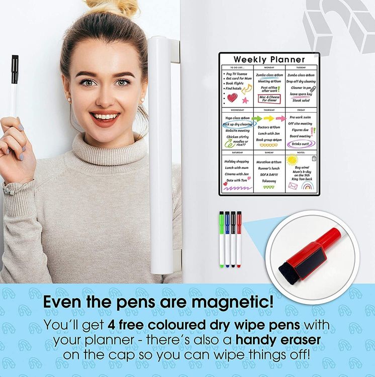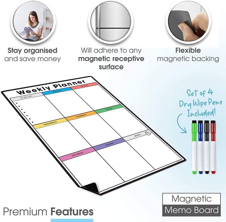 WHAT YOU GET: A multifunctional magnetic whiteboard to help you plan your week as easily and clearly as possible. It is designed to be flexible with a fully magnetic backing and dry erase finish, the memo board is suitable for use in a variety of environments from home to office. Each purchase comes comes with a pack of 4 multi-coloured pens that have their own eraser and magnet that will attract to many metal surfaces!