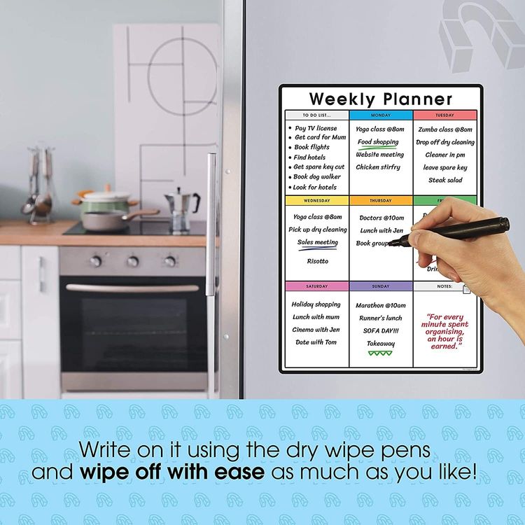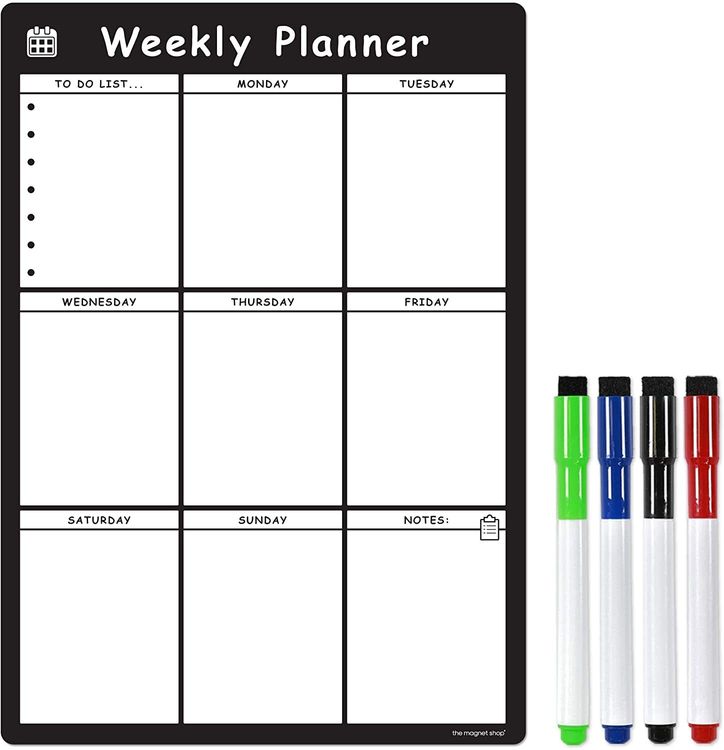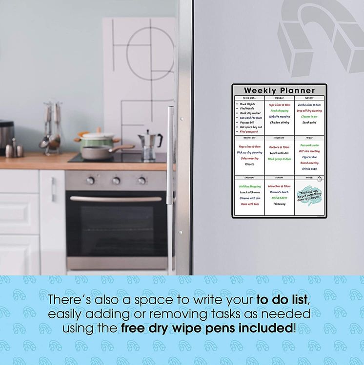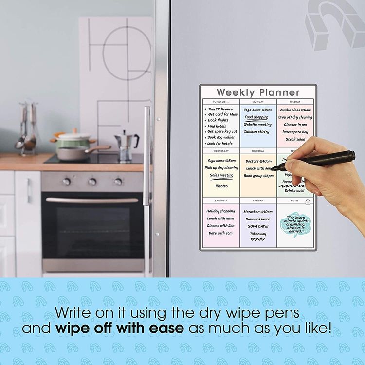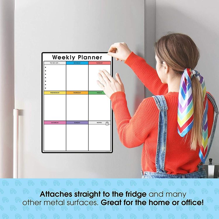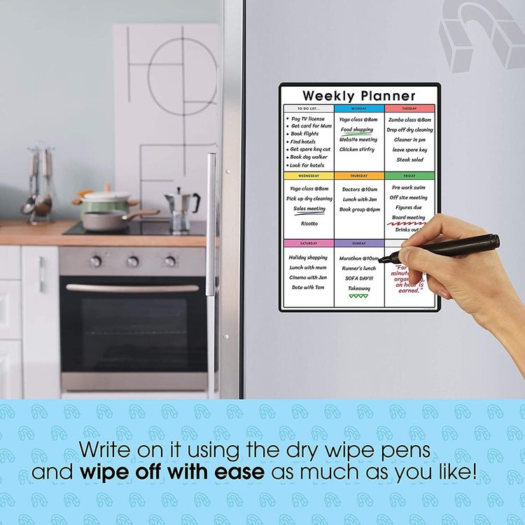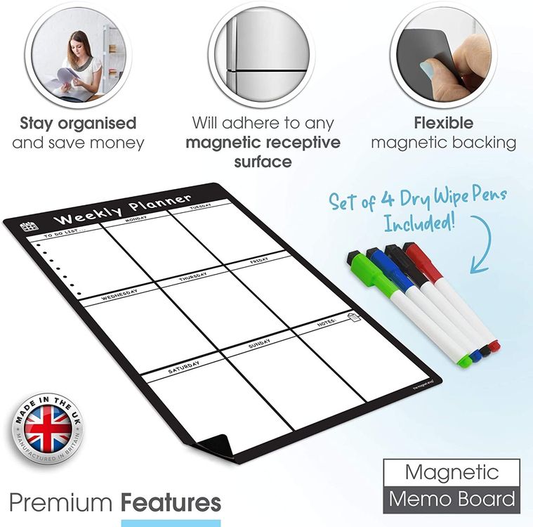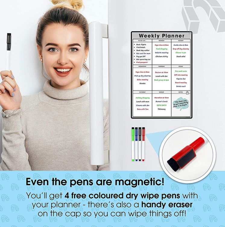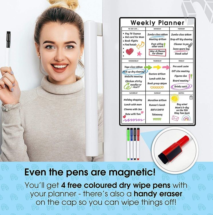 WHAT YOU GET: A multifunctional magnetic whiteboard to help you plan your week as easily and clearly as possible. It is designed to be flexible with a fully magnetic backing and dry erase finish, the memo board is suitable for use in a variety of environments from home to office. Each purchase comes comes with a pack of 4 multi-coloured pens that have their own eraser and magnet that will attract to many metal surfaces!