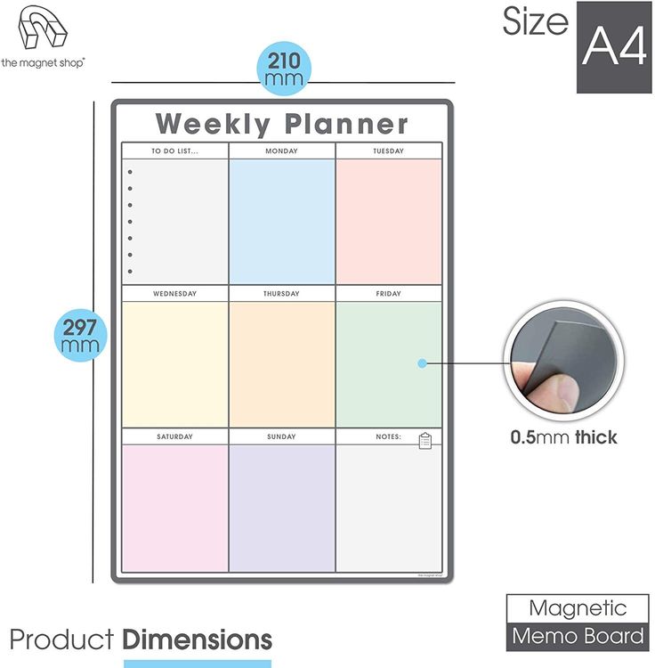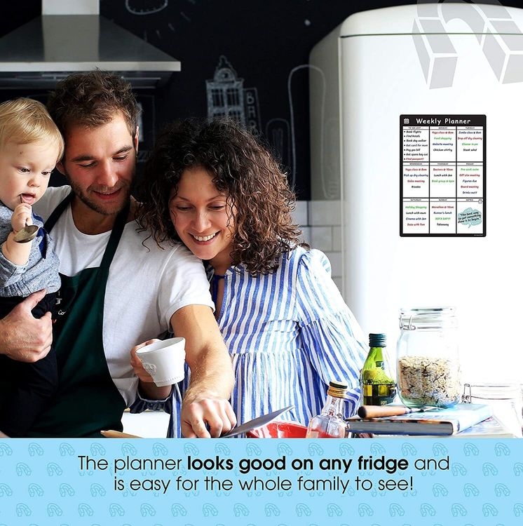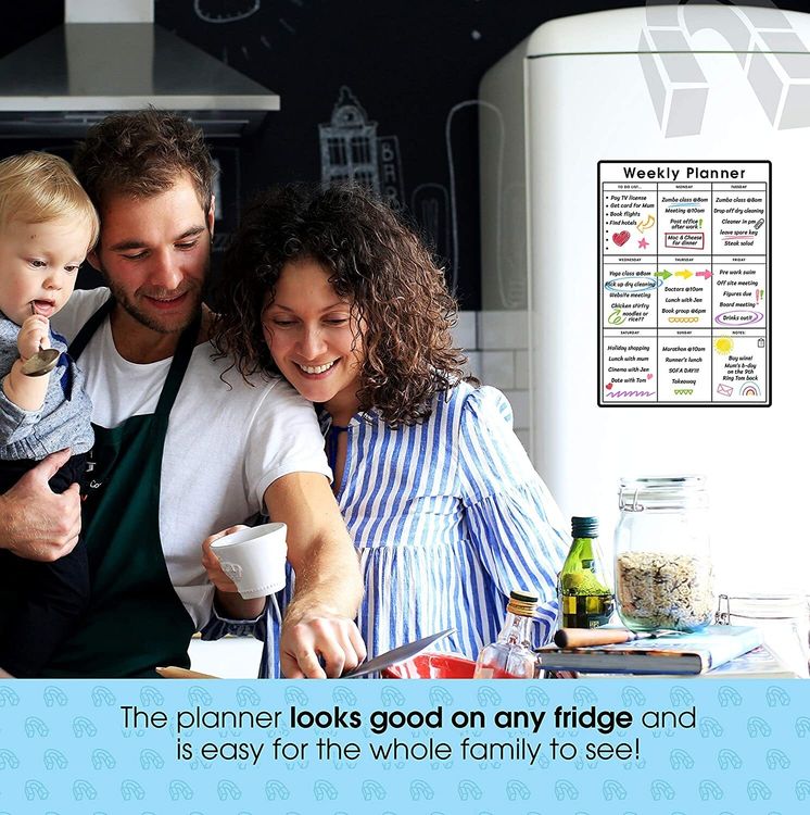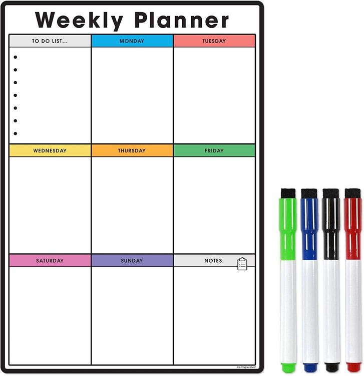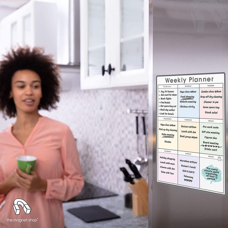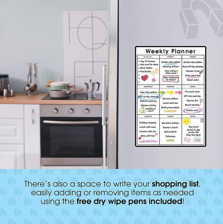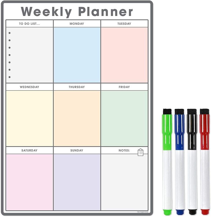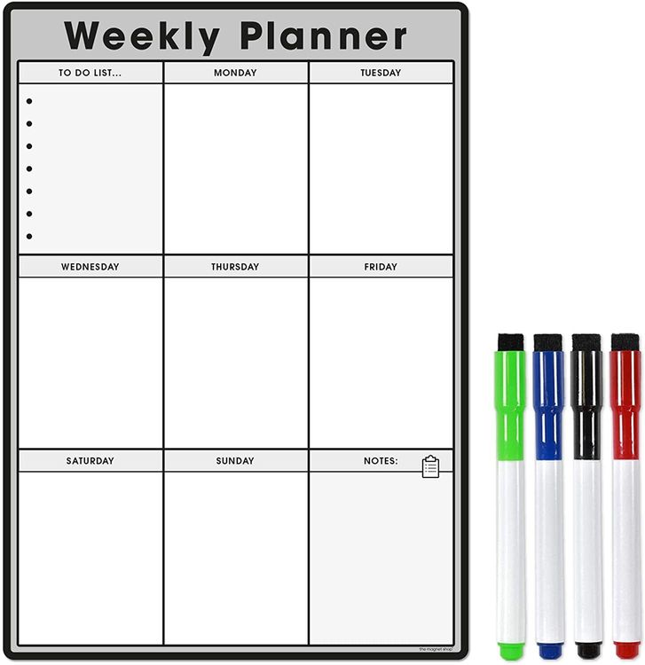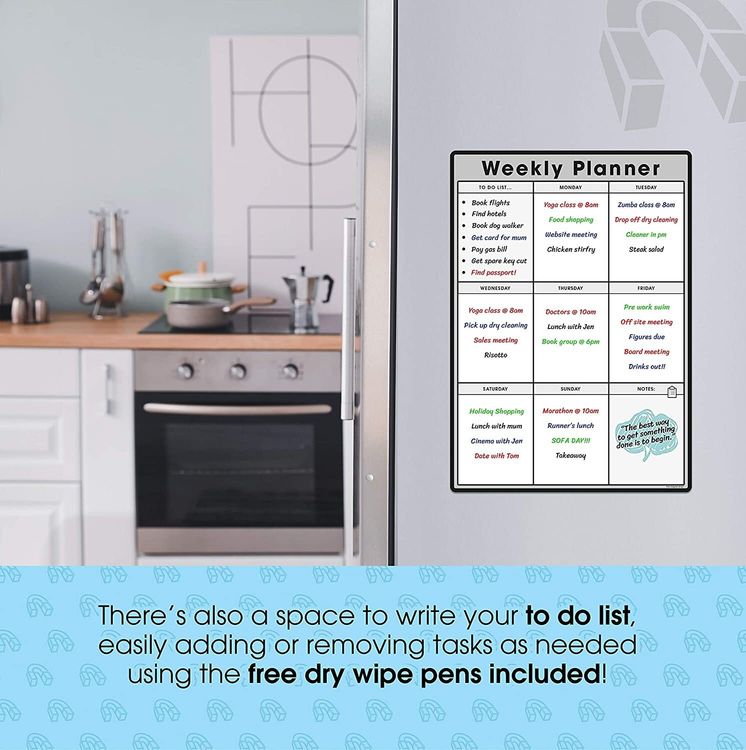 WHAT YOU GET: A multifunctional magnetic whiteboard to help you plan your week as easily and clearly as possible. It is designed to be flexible with a fully magnetic backing and dry erase finish, the memo board is suitable for use in a variety of environments from home to office. Each purchase comes comes with a pack of 4 multi-coloured pens that have their own eraser and magnet that will attract to many metal surfaces!