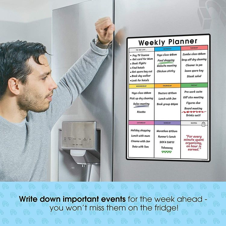 To ensure the maximum lifespan, avoid leaving oil and dust staining by regularly cleaning the notes with a cloth and warm soapy water. Please ensure that the cloth does not have any grit on it, or you may permanently damage the dry erase surface. Always use the right markers. Only use water-based markers, as oil based marker pens are not compatible with this product. Stick to ferrous. The magnetic planners can only stick to iron objects and magnetically receptive surfaces. For example, fridge doors, filing cabinets, iron doors and shelves etc. Not compatible stainless steel, aluminium and plastic objects.