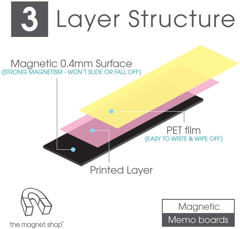 QUALITY CONSTRUCTION: Made in the UK from fine materials so you can be sure your new magnetic memo board will last a lifetime. Our whiteboards are made in a 3 layer process; flexible magnetic base, followed by premium paper, digitally printed to the highest of standards and finished with a specialist gloss ensuring a long lasting dry wipe surface. Wherever possible we work with ethically audited suppliers to ensure our products are made from sustainable materials, so buy with confidence!